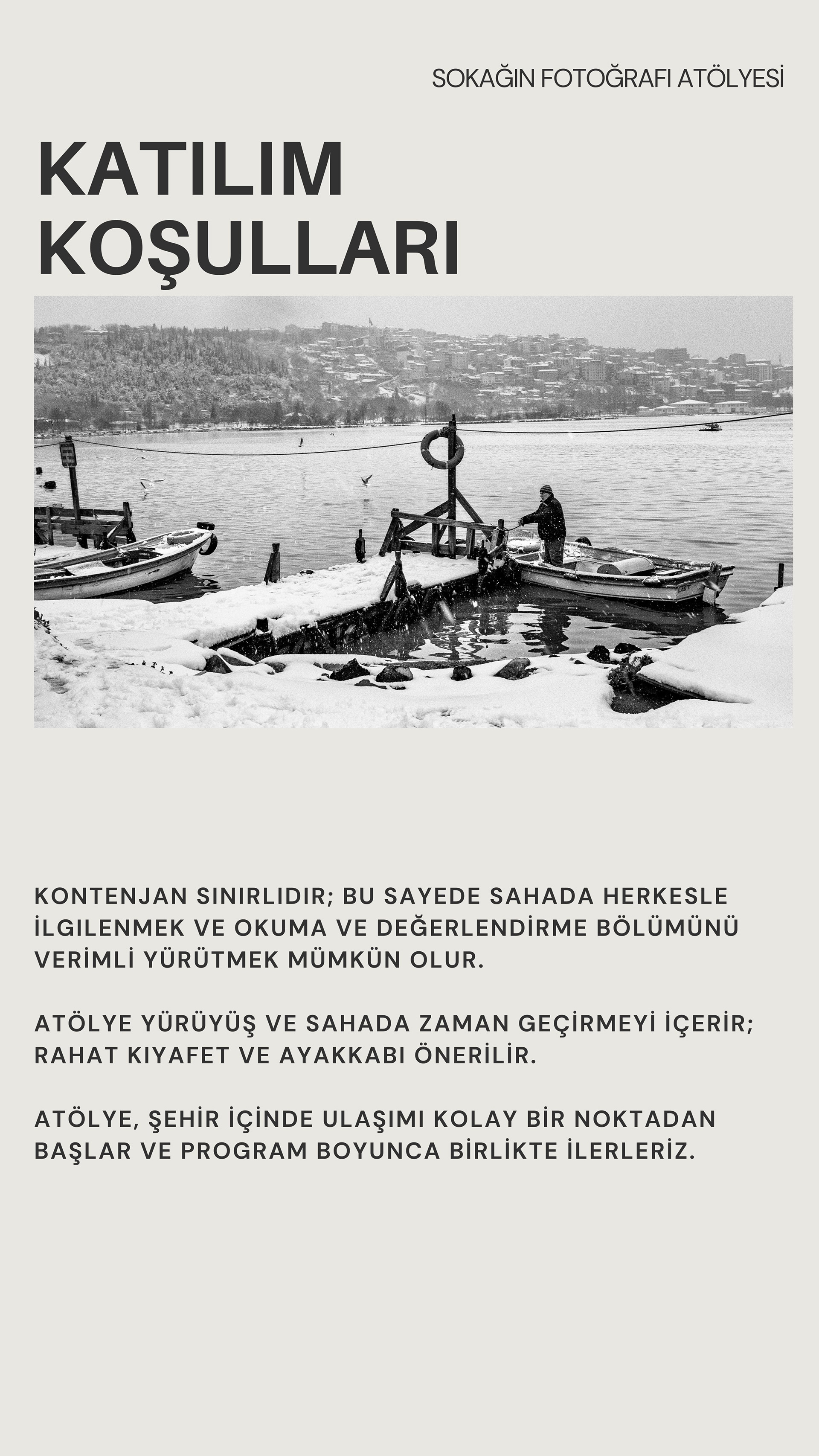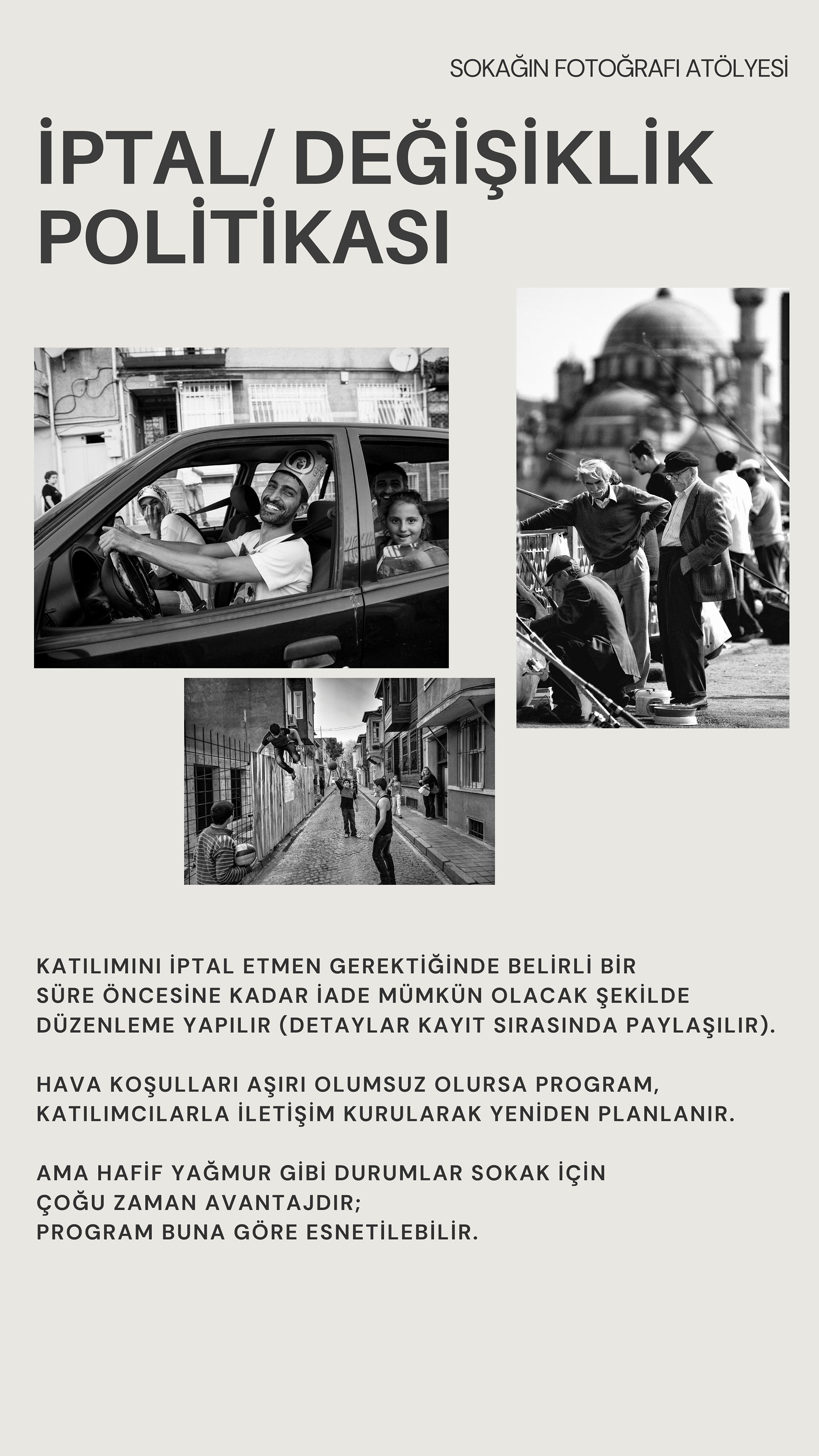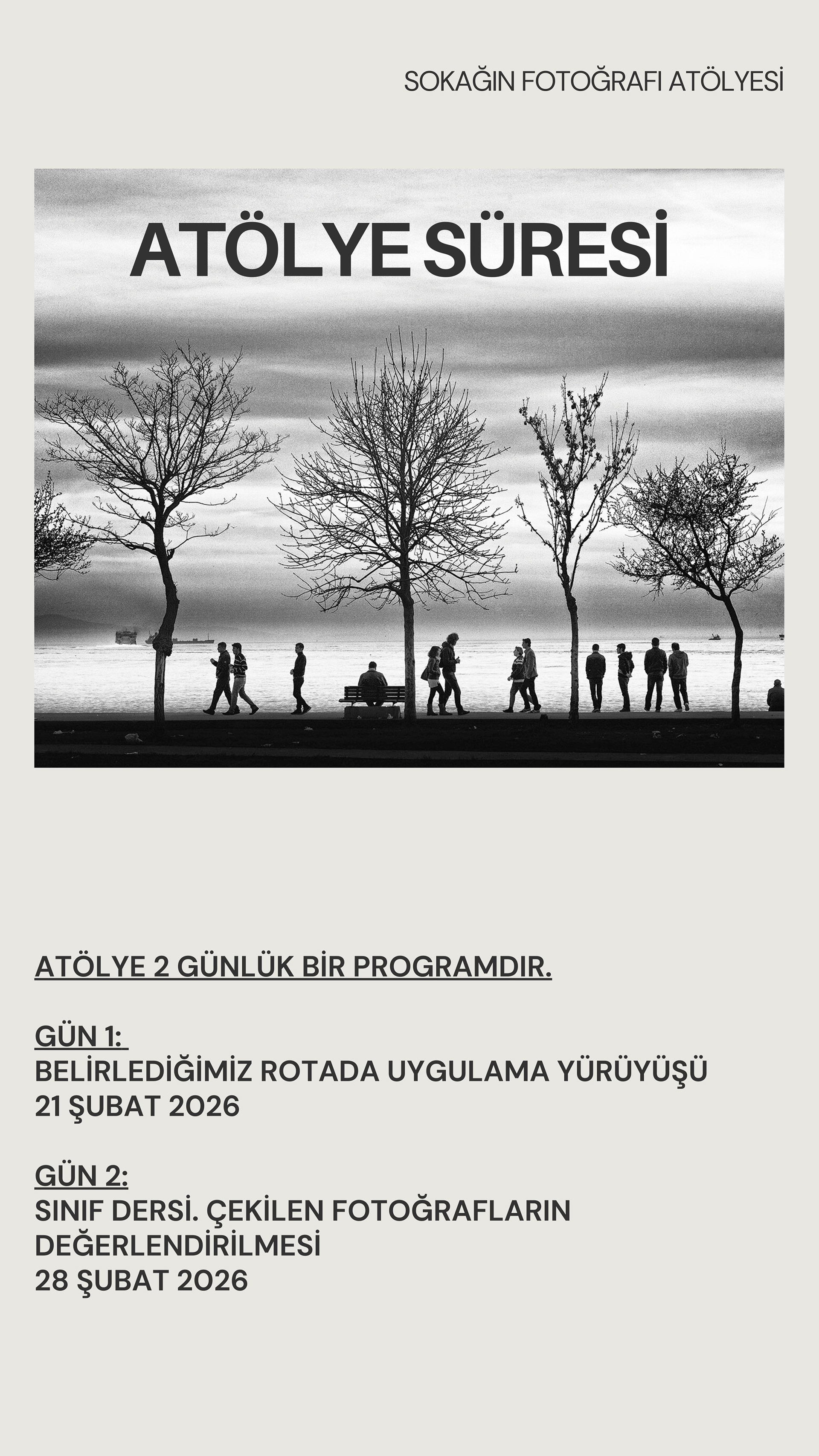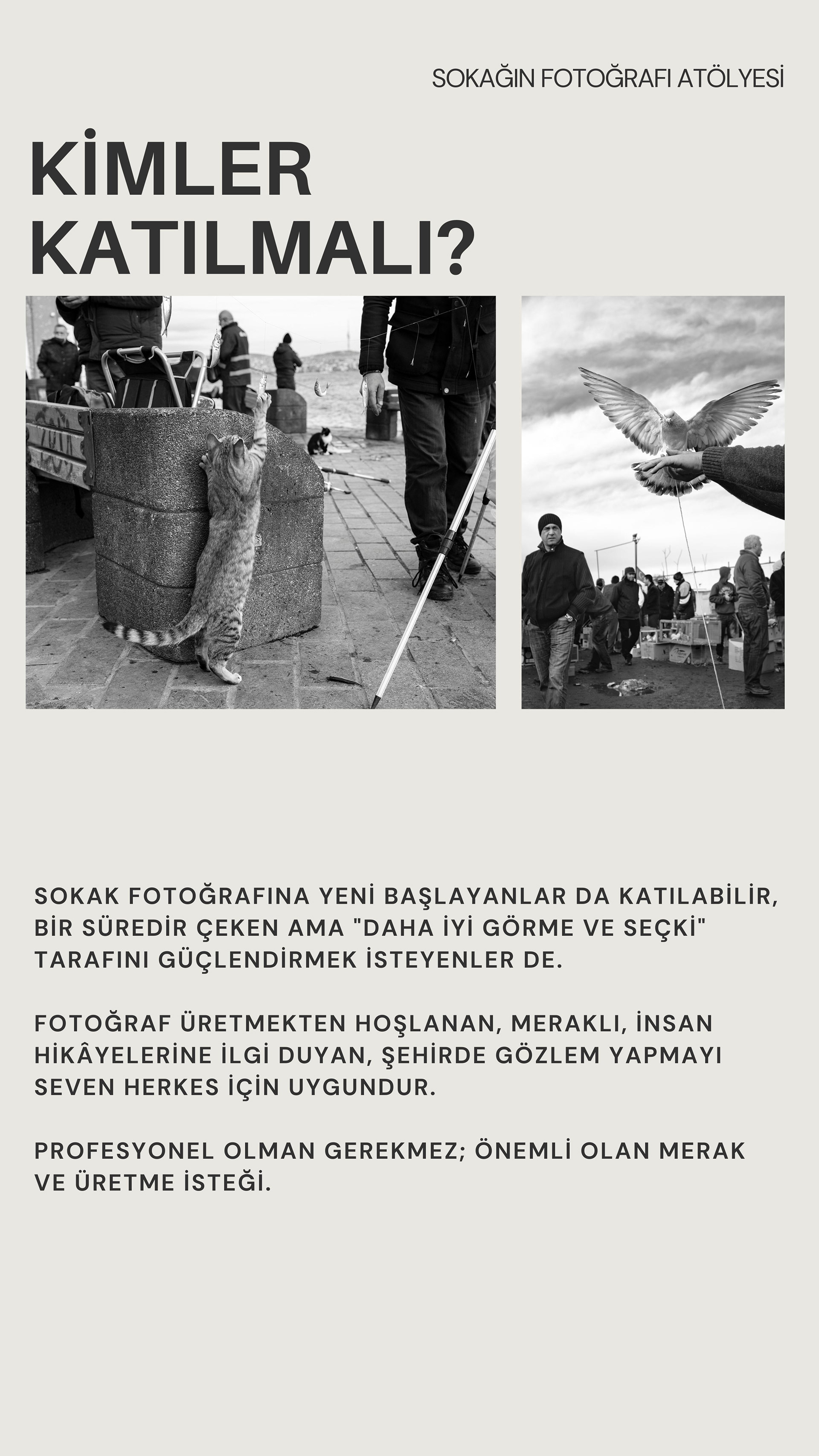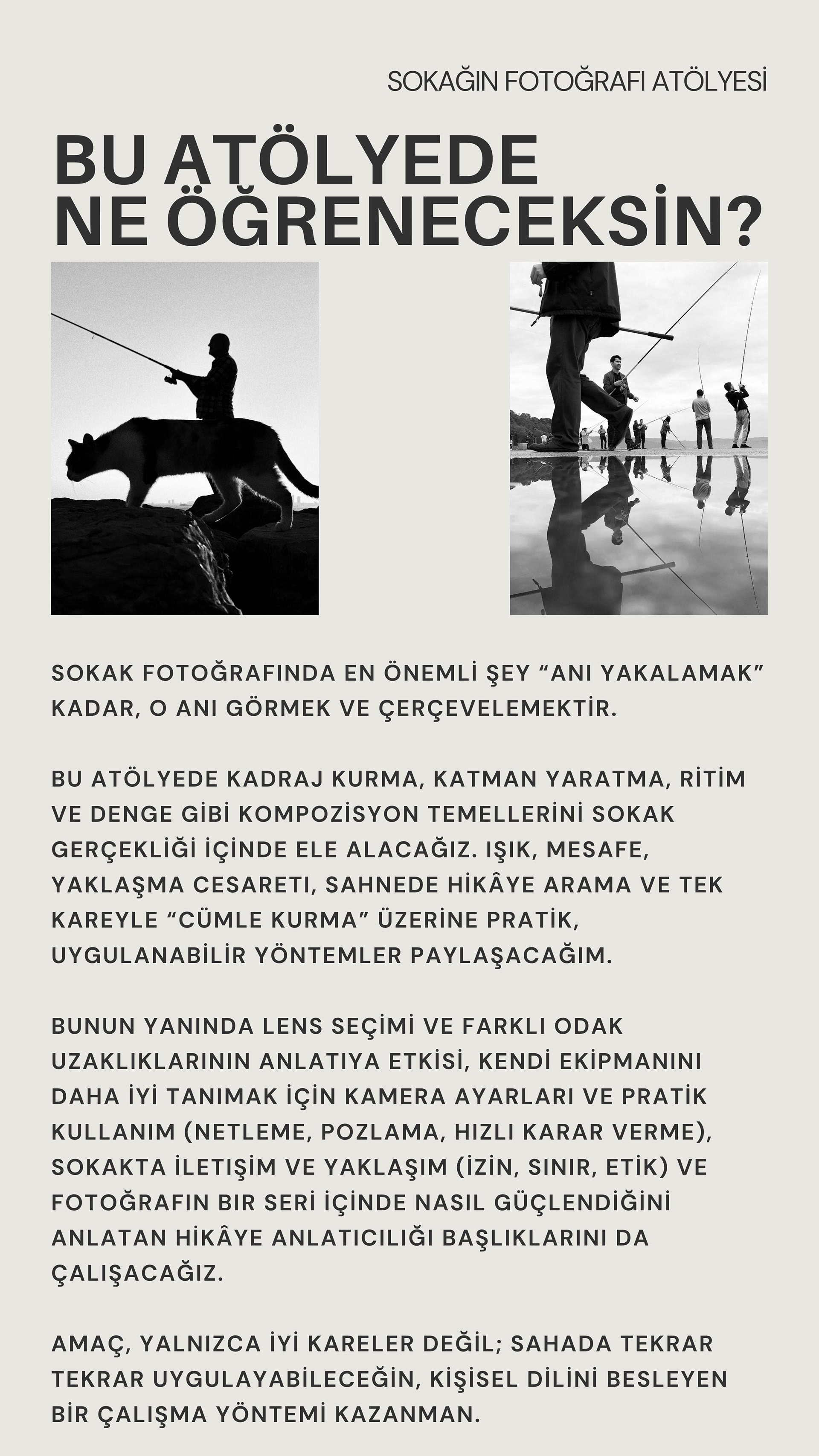 Bu atölyeler, şehrin içinde yürürken gözünü keskinleştirmen, kararlarını hızlandırman ve fotoğraflarına daha tutarlı bir dil kazandırman için tasarlandı. Bir gün boyunca birlikte üretecek, sahada deneyecek ve yaklaşımını netleştireceğiz; birkaç gün sonra online buluşmada ise fotoğraflarını birlikte okuyup değerlendirecek, somut önerilerle geliştireceğiz. Eğer fotoğrafta bir eşik arıyorsan, bu buluşma o eşiğin tam kendisi olabilir.