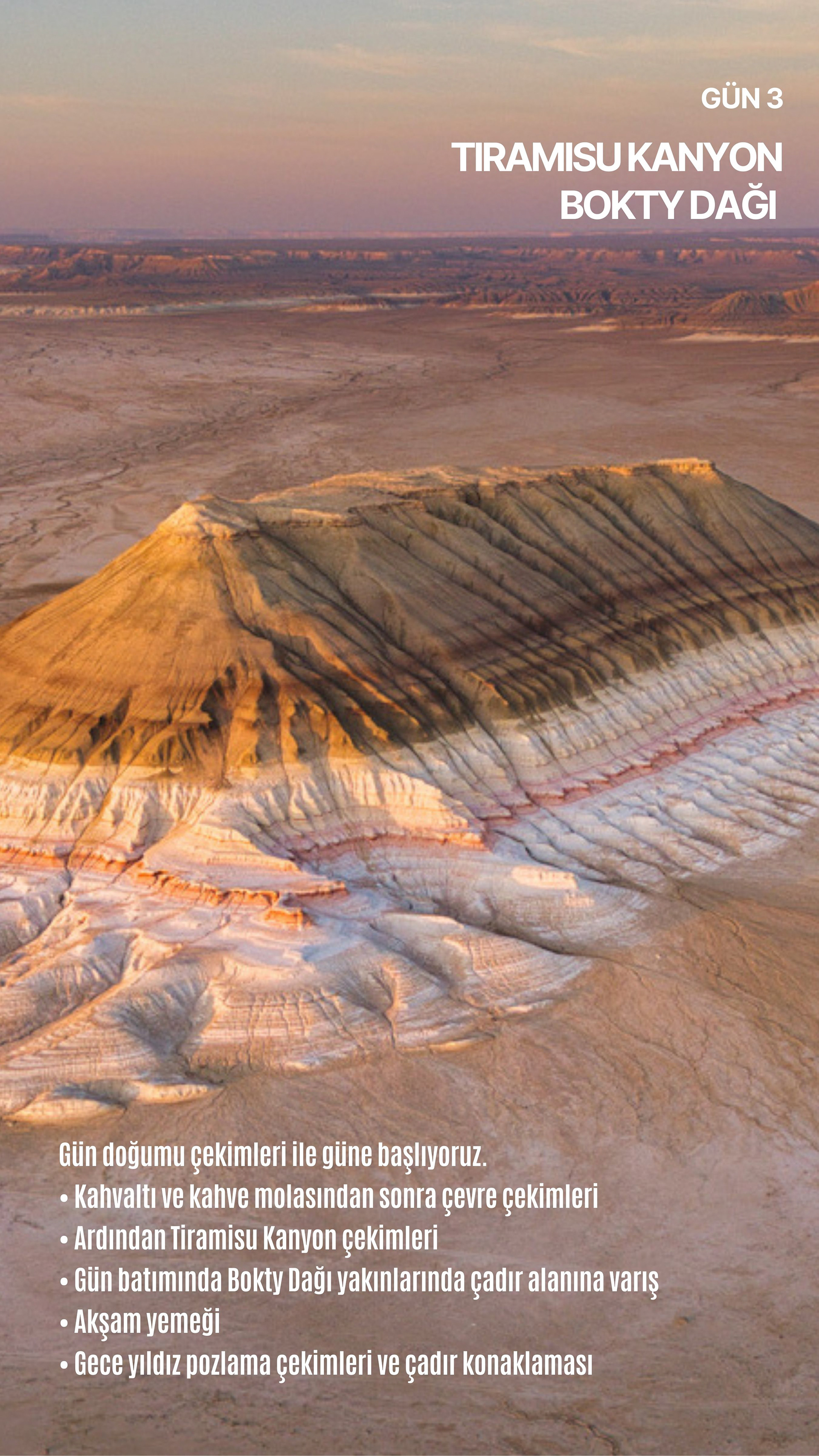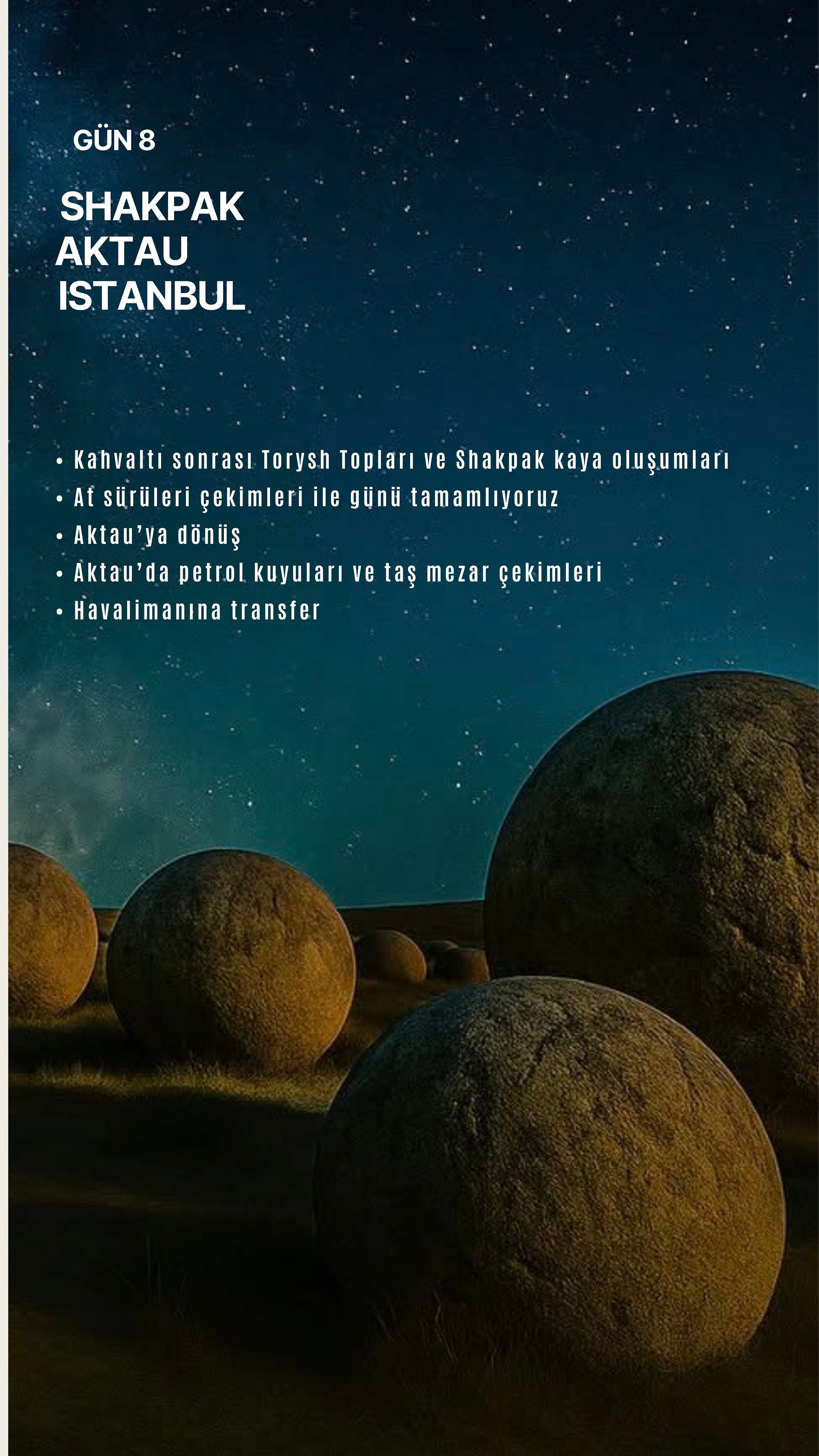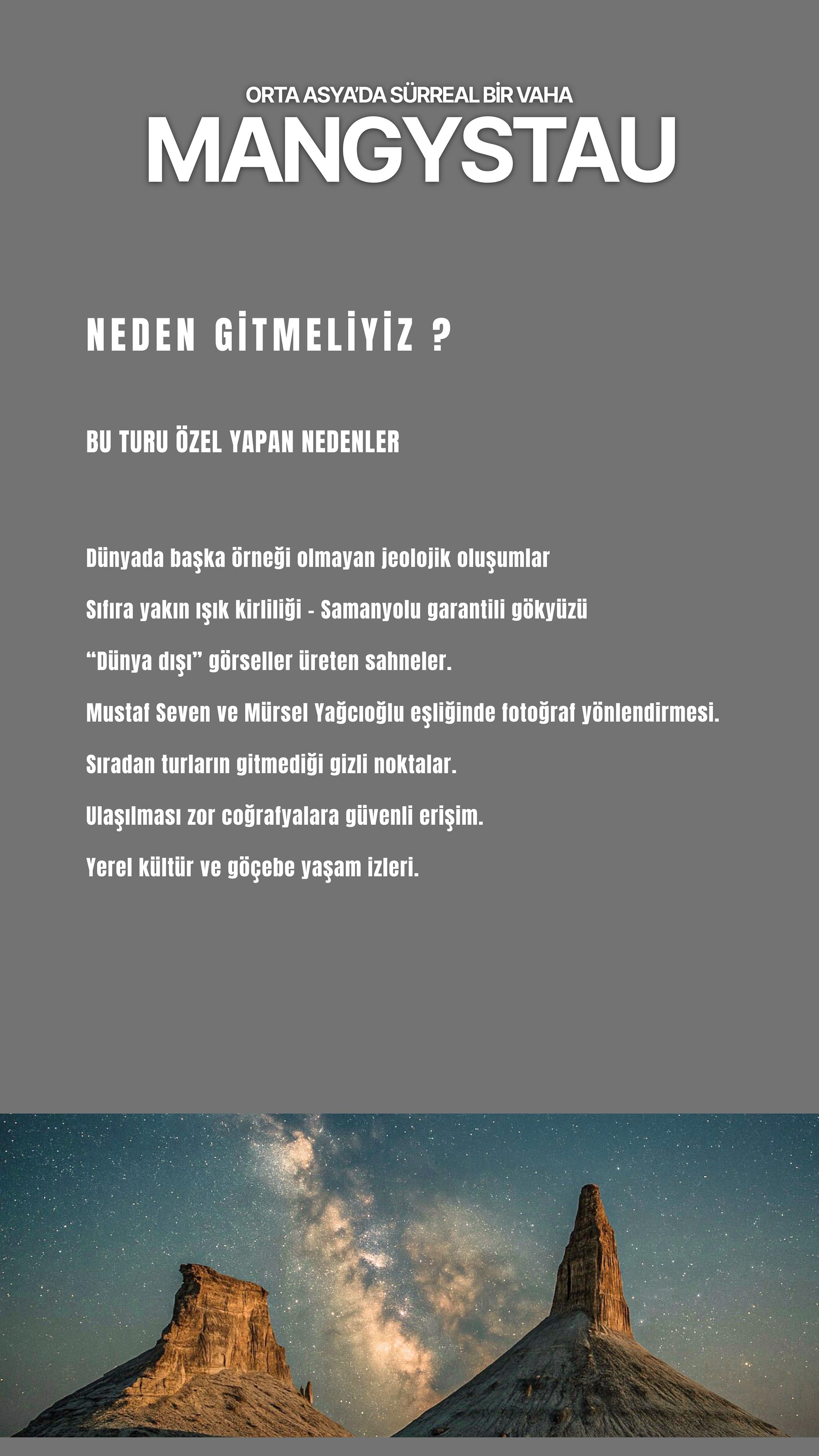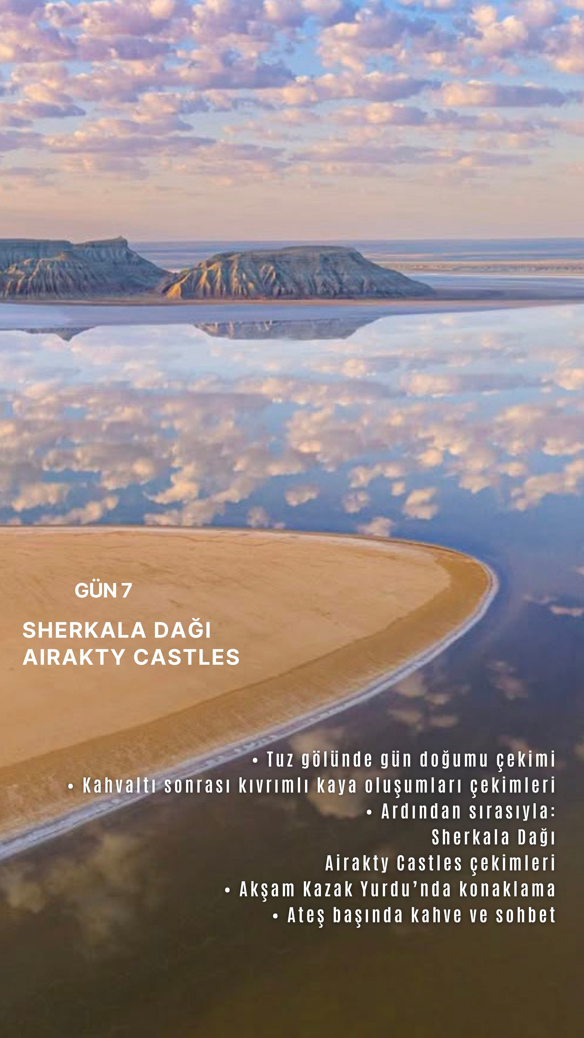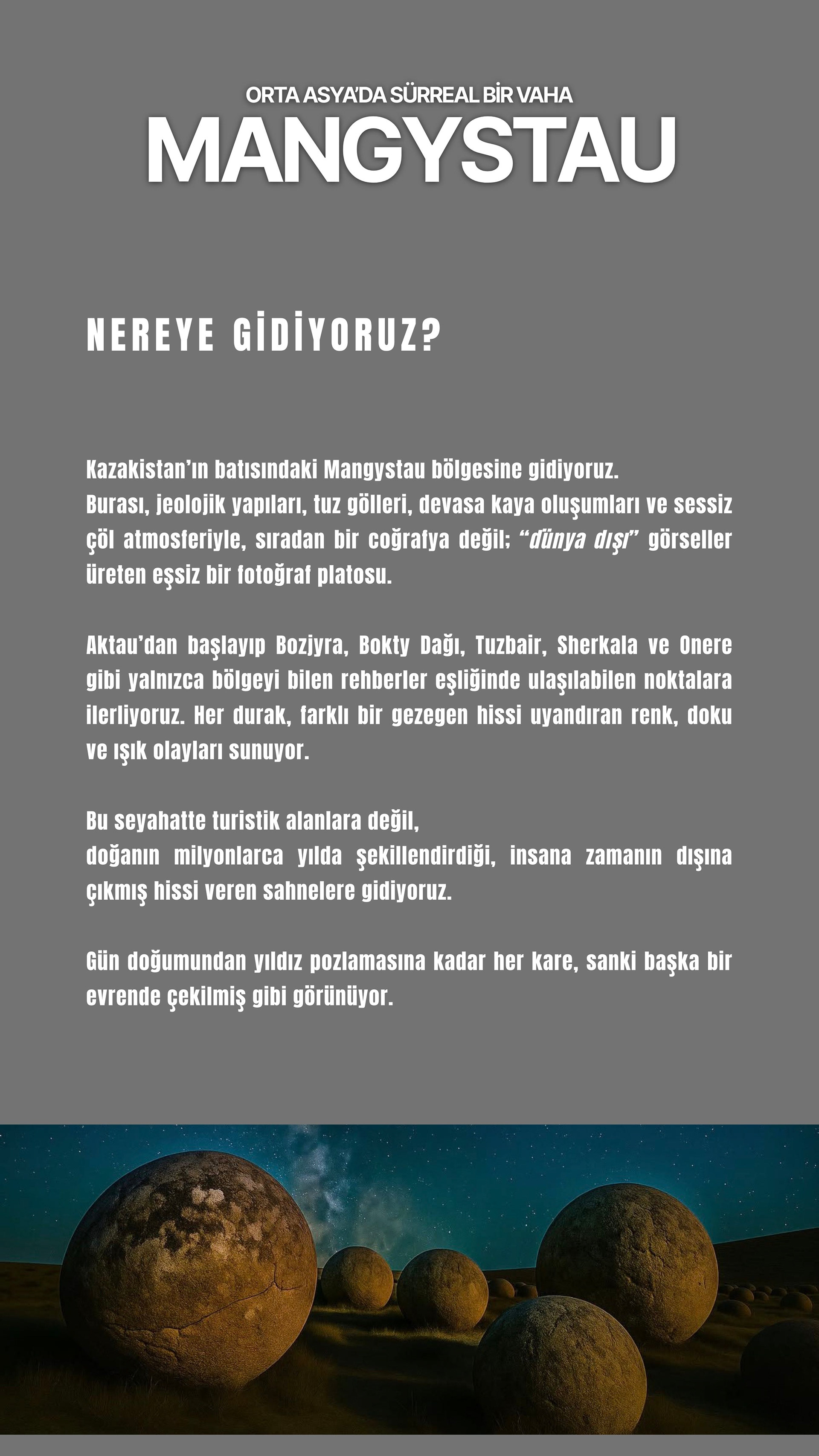 Aktau'dan başlayıp Boziyra, Bokty Dağı, Tuzbair, Sherkala ve Onere gibi yalnızca bölgeyi bilen rehberler eşliğinde ulaşılabilen noktalara ilerliyoruz. Her durak, farklı bir gezegen hissi uyandıran renk, doku ve ışık olayları sunuyor.