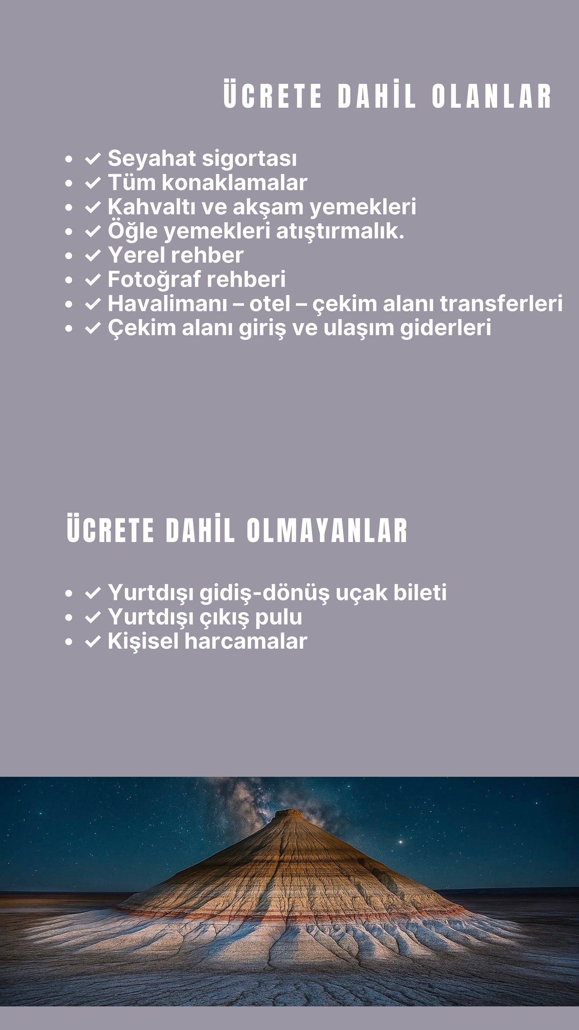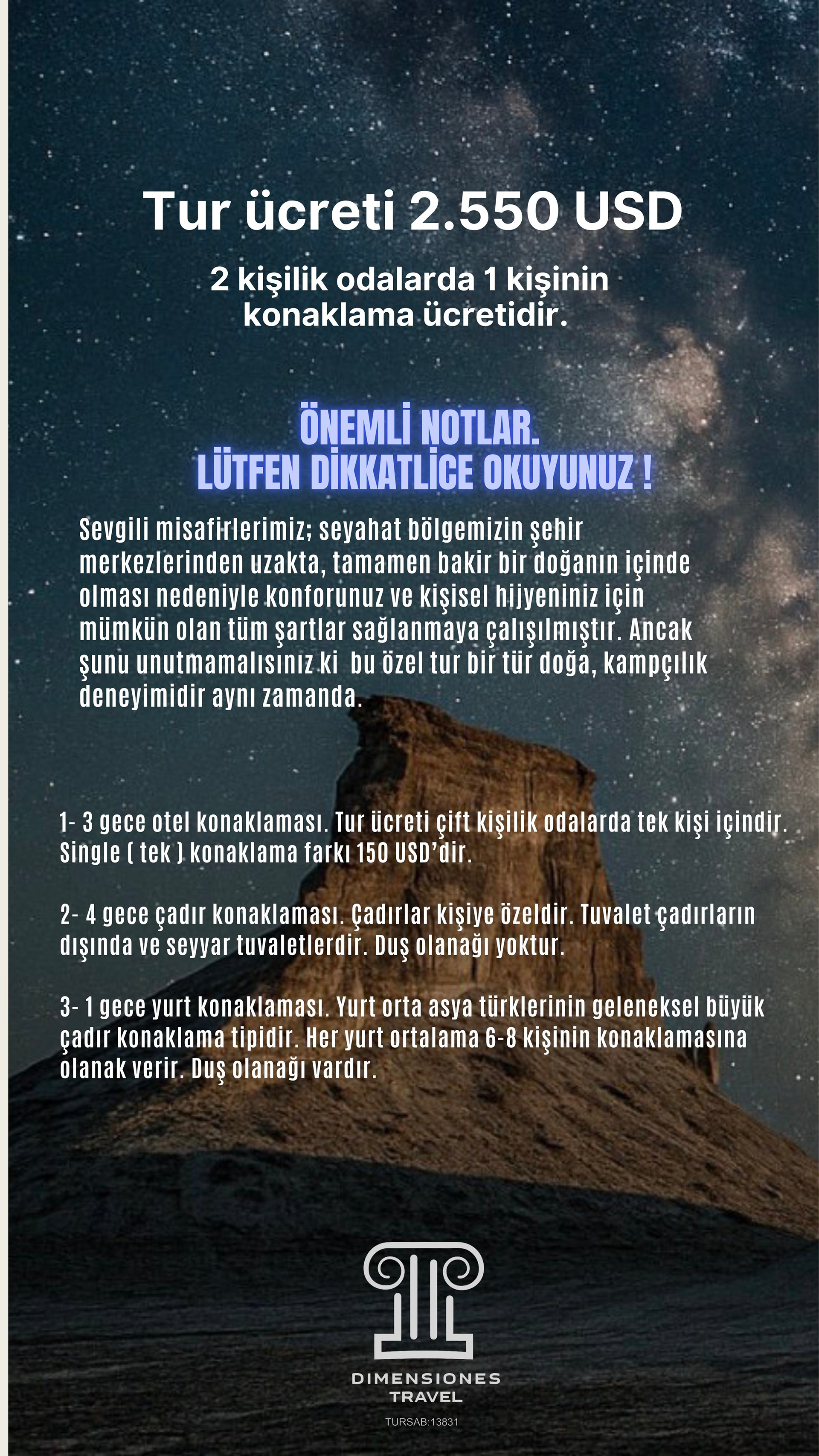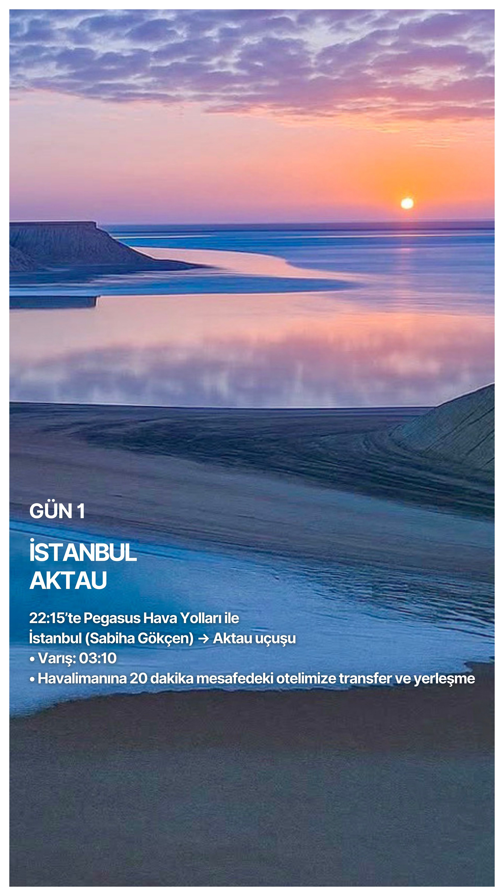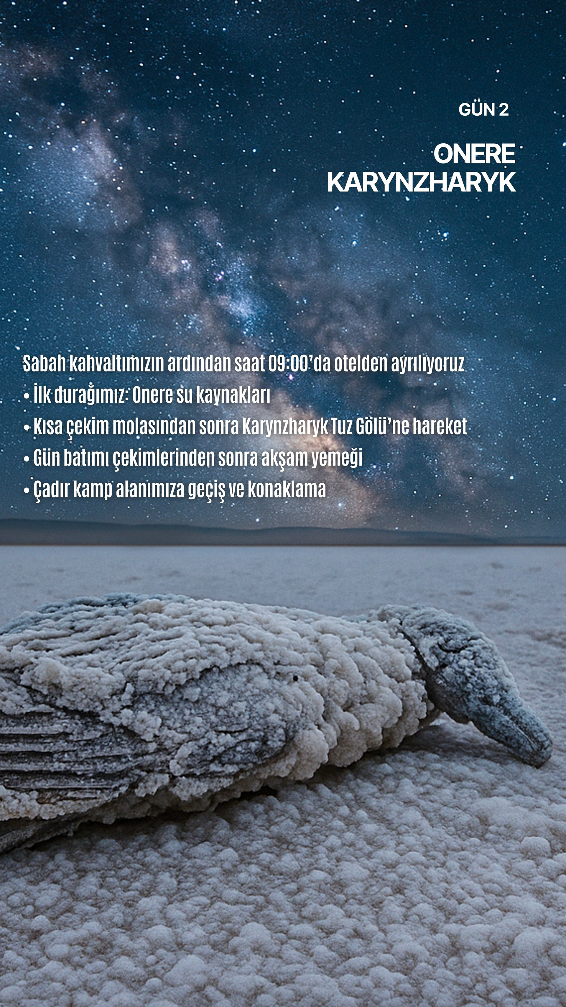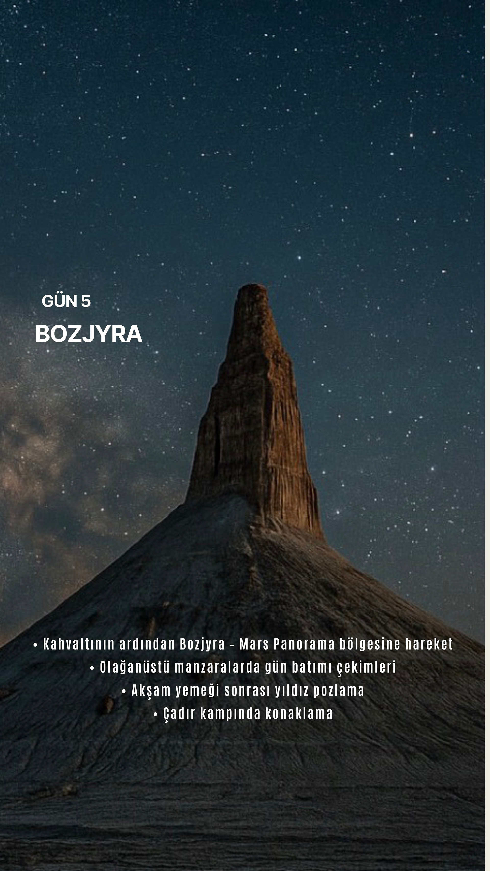 Aktau'dan başlayıp Boziyra, Bokty Dağı, Tuzbair, Sherkala ve Onere gibi yalnızca bölgeyi bilen rehberler eşliğinde ulaşılabilen noktalara ilerliyoruz. Her durak, farklı bir gezegen hissi uyandıran renk, doku ve ışık olayları sunuyor.
